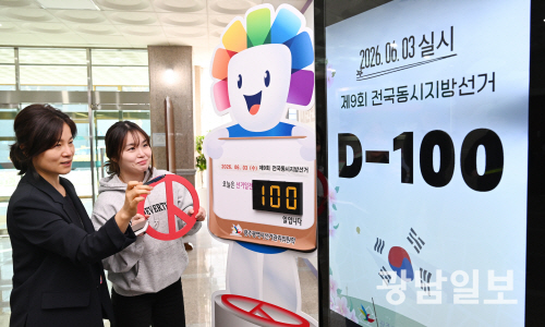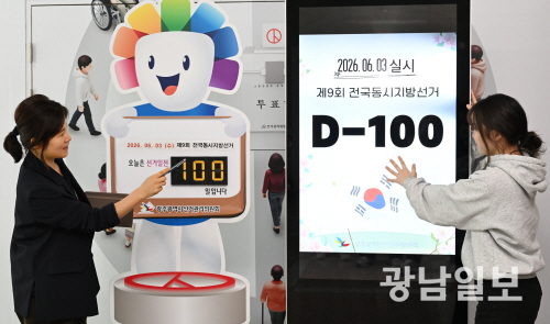 | 지방선거 D-100 제9회 전국동시지방선거를 100일 앞둔 23일 오후 광주시선거관리위원회에서 직원들이 전국동시지방선거 D-100을 알리는 전광판을 설치하고 있다.최기남 기자 bluesky@gwangnam.co.kr |