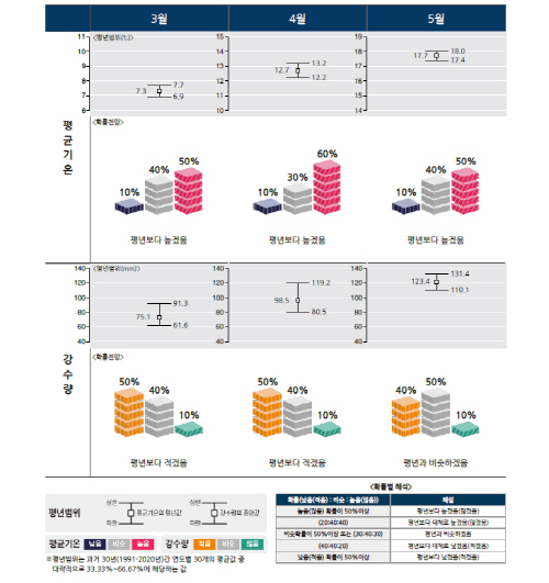 강수량은 대체로 평년보다 적거나 비슷할 것으로 예측됐다. 3월 강수량은 평년(61.6~91.3㎜)보다 적을 확률이 50%, 4월도 평년(80.5~119.2㎜)보다 적을 확률이 50%로 나타났다. 5월은 평년(110.1~131.4㎜)과 비슷할 확률이 50%로 전망됐다.