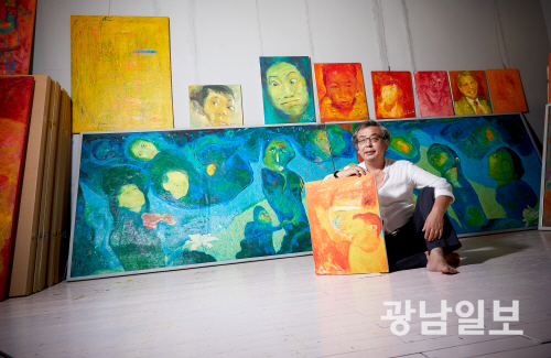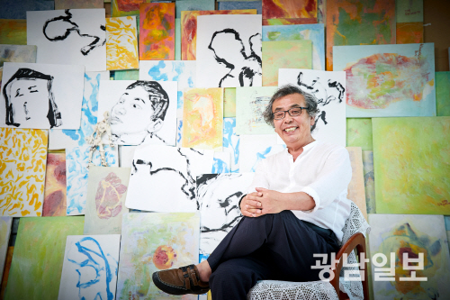 | 발달장애아동을 20년 넘게 그려온 김근태 작가가 동계올림픽 현장인 이탈리아 밀라노에서 열리는 ‘ArtPara Milano’ 그룹전에 참여한다. 사진은 작품 앞에서 포즈를 취한 김 작가. |
