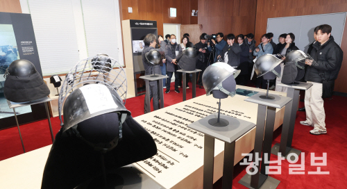 | 옛 전남도청에 전시된 5·18 기동타격대 방석모 24일 광주 동구 옛 전남도청에서 열린 문화체육관광부 옛전남도청복원추진단의 시범운영 설명회에서 참가자들이 5·18민주화운동 당시 기동타격대들이 썼던 방석모를 살펴보고 있다. 5·18 민주화운동 최후항쟁지이자 2023년 하반기 복원 공사가 시작된 옛 전남도청은 오는 28일 부터 한 달여간 시범 운영을 거친 뒤 오는 5월 개관할 예정이다. 최기남 기자 bluesky@gwangnam.co.kr |