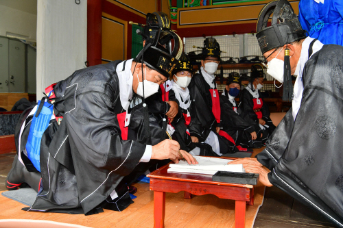 | 장성향교 추기석전대제에 참여한 김한종 군수(좌). 사진제공=장성군 |
