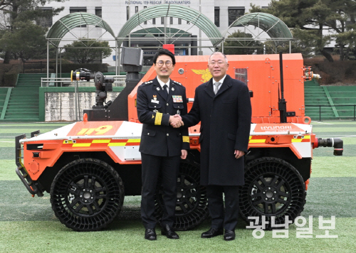 이날 행사에서 현대차그룹은 화재로부터 국민과 소방관의 안전을 지키기 위해 소방청과 함께 개발한 원격 화재 진압장비 ‘무인소방로봇’ 4대를 기증했다.