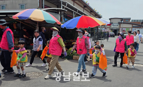 | 나주시 노인 일자리 사업에 참여한 어르신들이 목사고을시장에서 어린이들에게 전통시장 장보기 체험을 지도하고 있다. |