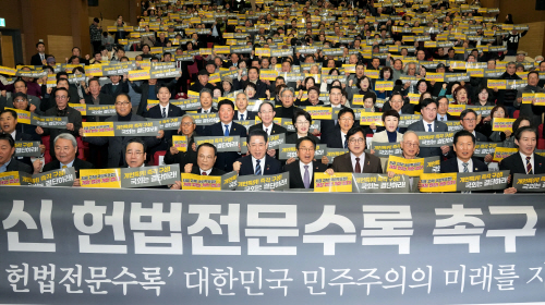 | 김영록 전남도지사가 25일 서울 국회에서 5·18단체, 시민단체 등 참석자들과 5·18정신 헌법전문 수록 국회 개헌특별위원회 구성 및 개헌 발의를 촉구하는 결의를 하고 있다. |
