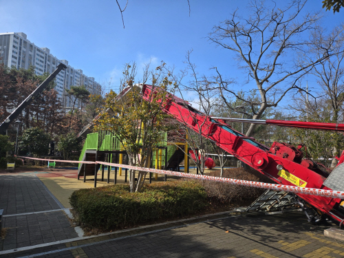 사고 직후 차량에서 수십m 가량 펼쳐진 사다리가 단지 내 놀이터를 덮쳤으나 다행히 인명피해는 없었다.