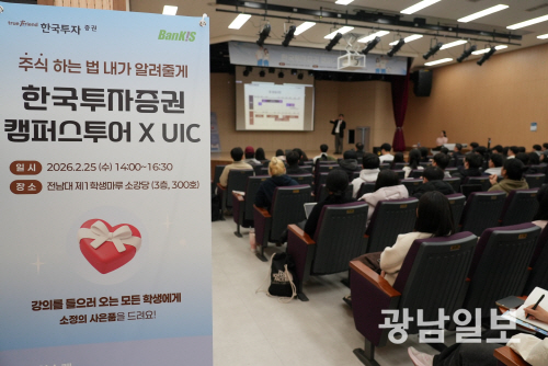 | 한국금융지주 자회사 한국투자증권은 지난 25일 전남대학교에서 대학생을 위한 찾아가는 투자교육 프로그램 ‘한투 캠퍼스 투어’를 진행했다고 26일 밝혔다. |
