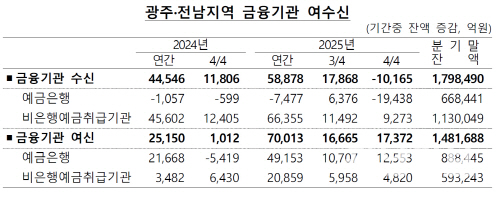 26일 한국은행 광주전남본부가 발표한 ‘2025년 4분기 광주·전남지역 금융기관 여수신 동향’에 따르면 전분기 6376억원 증가했던 지역 예금은행의 수신은 1조9438억원 대폭 감소했다.