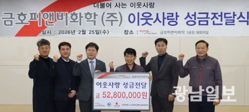 구자성 금호피앤비화학㈜ 부사장은 “임직원의 자발적인 참여로 마련된 성금이 지역사회에 작은 희망이 되길 바란다”며 “앞으로도 지역과 함께 성장하는 기업으로서 사회적 책임을 다하겠다”고 말했다.