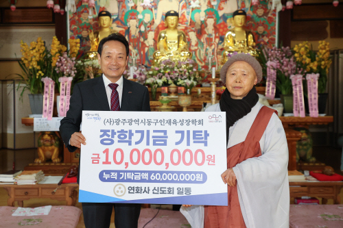 | 광주 연화사가 최근 법당에서 동구 인재육성장학회에 장학금 1000만원을 기탁하며 지역 인재 육성에 힘을 보탰다. |