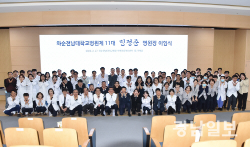 | 화순전남대학교병원 미래의료혁신센터 미래홀에서 열린 제11대 민정준 병원장 이임식에서 민 병원장과 병원 구성원들이 기념촬영을 하고 있다. |