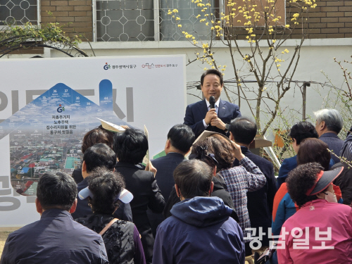 | 광주 동구는 지난해 3월 산수동 512-33번지 호랑꼬두메 마을 정원에서 저층 주거지 집수리 지원사업 착공을 기념하는 ‘더 삶 집수리 Day’ 행사를 개최했다. 사진은 임택 동구청장이 축사를 하고 있는 모습. |
