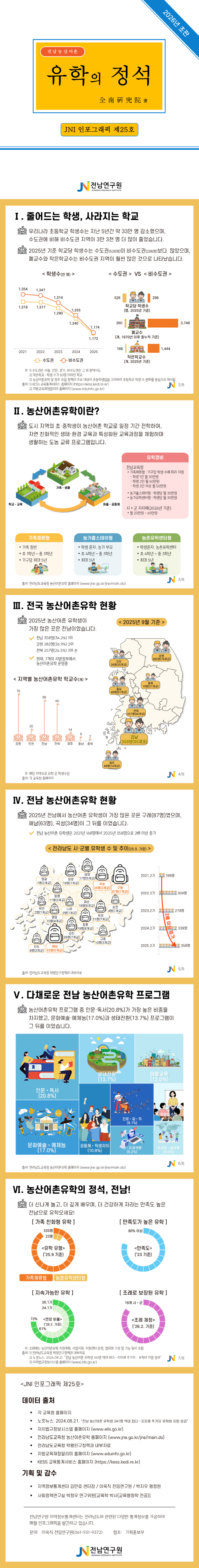 전남연구원은 3일 JNI 인포그래픽 ‘전남 농산어촌유학의 정석’을 통해 전국 초등학생 감소 추이와 작은학교 증가 현황을 짚고, 전남 농산어촌유학의 성과와 정책 과제를 제시했다.