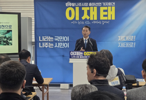 | 이재태 전남도의원이 나주시장 출마 기자회견을 하고 있다. |