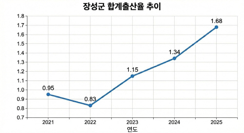 5일 통계청이 최근 발표한 ‘2025년 출생·사망 통계’에 따르면 지난해 장성 지역 합계출산율은 1.68명으로 전국 2위를 차지했다. 코로나19 팬데믹 시기였던 2022년 0.83명까지 떨어졌지만 2023년 1.15명으로 반등한 뒤 2024년 1.34명, 2025년 1.68명으로 가파른 상승 곡선을 그리고 있다.