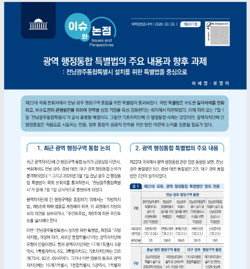 국회를 통과한 특별법의 주요 내용을 살펴보고, 향후 광역 간 행정통합이 성공적으로 안착하기 위한 향후 과제를 제시한 것이다.