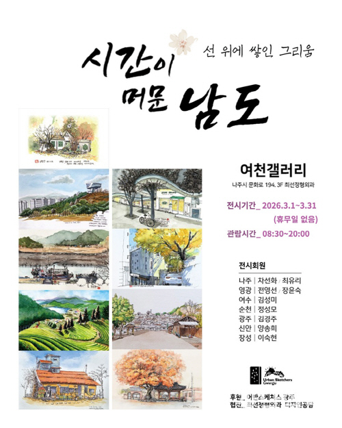 어반 스케쳐스 광주(Urban Sketchers Gwangju) 회원들은 지난 1일 개막, 오는 31일까지 나주 광주전남혁신도시 빛가람동 소재 여천갤러리에서 ‘시간이 머문 남도, 선 위에 쌓인 그리움’이라는 주제로 어반스케치전을 갖는다. 출품작은 9명의 회원이 각 5점씩, 최선 정형외과 병원 관련 어반 스케치 작품 18점 등 총 63점이며, 전시 기간 중 작품을 조금씩 더 늘려가며 선을 보이게 된다.