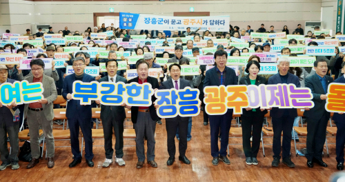 강 시장은 앞서 이날 오전 장흥군민회관에서 김성 장흥군수, 도·군의원, 장흥군민 등 300여명이 참석한 가운데 열린 상생토크에선 장흥과 관련한 특별법 특례 조항을 소개하고 지역 특성을 반영한 발전 전략을 제시했다.