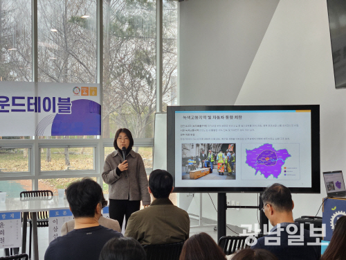 | 광주시지속가능발전협의회는 5일 서구 치평동 에너지파크 해담마루에서 ‘기후도시 광주 교통정책 전망 라운드 테이블’을 개최했다. 사진은 고이지선 녹색전환연구소 지역전환팀장이 주제 발표를 하는 모습. |