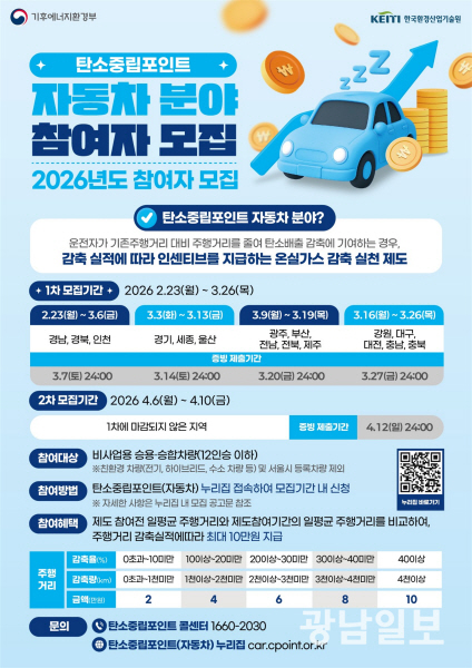나병춘 광주시 기후대기정책과장은 “광주지역 온실가스 배출량 가운데 자동차 부문이 약 32%를 차지한다”며 “올해는 모집 규모를 대폭 확대한 만큼 유류비 절감과 현금 인센티브를 동시에 받을 수 있는 자동차 탄소중립포인트제에 시민들의 적극적인 참여를 바란다”고 말했다.