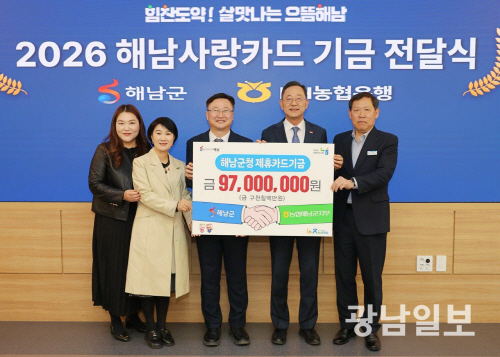 농협은행 해남군지부는 6일 군지부 회의실에서 현조 지부장과 명현관 해남군수가 참석한 가운데 해남사랑카드 적립기금 9700만원을 해남군에 전달했다.