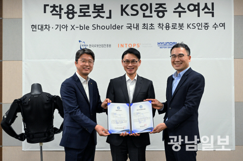 | 현대자동차·기아는 산업용 착용로봇 ‘엑스블 숄더’가 한국로봇산업진흥원으로부터 KS 인증을 획득했다. ‘엑스블 숄더’ 생산 업체인 인탑스 구미 공장에서 열린 KS 인증 수여식. (좌측부터)한국로봇산업진흥원 김태우 본부장, 인탑스 김근하 대표, 현대차·기아 로보틱스랩 최리군 상무. |