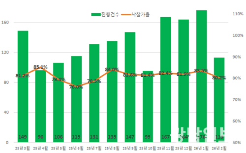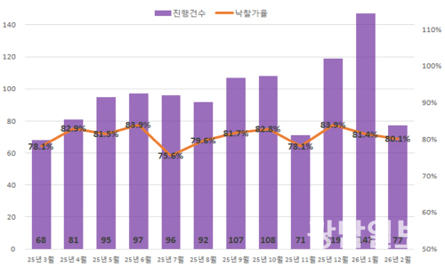 9일 법원경매 전문기업 지지옥션에 따르면 ‘2026년 2월 지지경매 동향보고서’를 분석한 결과, 지난달 광주의 아파트 경매 건수는 77건 중 20건이 낙찰됐다. 지난 1월 147건으로 11개월 만에 최고치를 달성한 경매 건수는 지난달 설 명절 영향으로 전월 대비 절반 수준으로 줄었다.