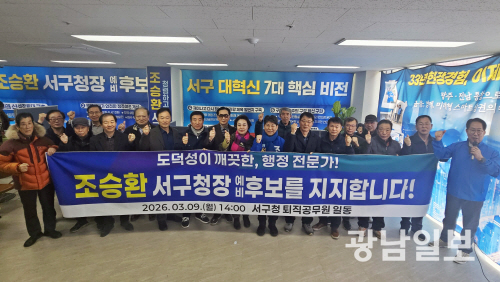 서구청 퇴직공무원들은 9일 “조승환 예비후보는 서구청에서 33년간 공직에 몸담으며 총무, 복지, 경제문화, 의회사무국장 등 주요 보직을 두루 거친 행정 전문가”라며 “서구 행정을 누구보다 잘 알고 주민 중심 행정을 실천해 온 준비된 후보”라며 지지를 공식 선언했다.