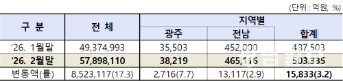 이런 성장에도 불구하고 반도체주 중심 성장세에 2월 말 전체 상장법인의 시가총액 중 광주·전남 상장법인 시가총액은 0.9%로 전월보다 0.1%p 감소했다.