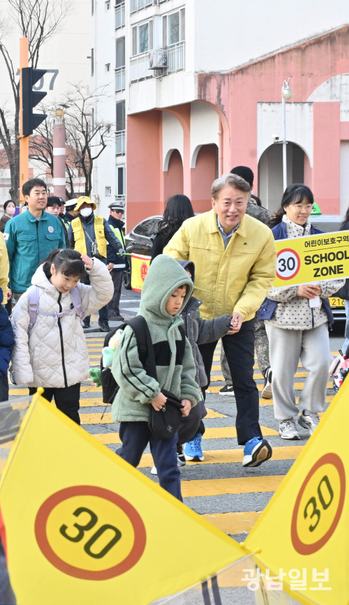 등굣길 어린이안전 캠페인 새학기를 맞아 11일 오전 광주 서구 유덕초등학교앞에서 열린 초등학교 주변 합동 안전점검에 참석한 김이강 서구청장과 새마을 교통봉사대,안전모니터봉사단등 자생단체 회원들이 안전캠페인을 펼치고 있다. 최기남 기자 bluesky@gwangnam.co.kr