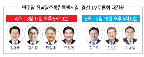 조별 TV토론은 광주MBC 스튜디오에서 열린다. A조 토론은 17일 오후 5시10분부터 7시5분까지 진행되고, B조 토론은 18일 같은 시간대에 진행될 예정이다.