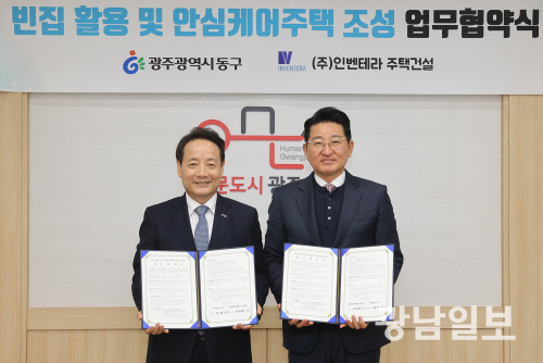 | 광주 동구는 최근 청사 3층에서 인벤테라 주택건설과 ‘안심케어주택(퇴원환자 징검다리하우스)’ 조성을 위한 민관 협력 업무협약을 체결했다. 사진제공=광주 동구 |