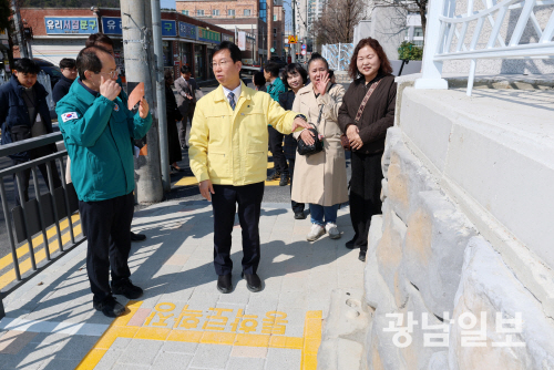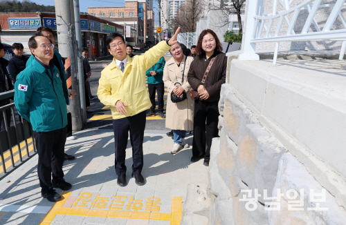 | 뉴빌리지 통학로 개선 현장점검하는 박병규 광산구청장 광주 광선구 우산동 뉴빌리지 통학로 개선 사업 준공을 앞두고 13일 오전 박병규 광산구청장과 공직자들이 사업 현장을 점검했다.우산동 뉴빌리지 사업은 2029년까지 국·시비 등 총 196억 원을 투입해 정주 여건을 대대적으로 개선하는 사업으로, 광산구는 복합문화돌봄시설 조성,어린이 테마공원 및 공영주차장 조성,노후주택 및 빈집 정비 등 다양한 사업을 추진하고 있다.최기남 기자 bluesky@gwangnam.co.kr |