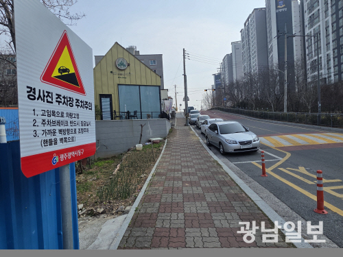 같은 날 서구 화정동과 동구 계림동 주택가 경사로 상황도 크게 다르지 않았다. 일부 지역에는 주정차 금지 표지판만 설치돼 있을 뿐 경사로 주차 시 안전 조치를 안내하는 표지판이나 홍보물은 찾아보기 어려웠다.