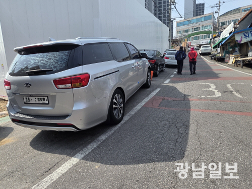 | 16일 오전 광주 동구 계림동 노상 주차장에 주차된 차량들에는 고임목이 설치되지 않았다. |