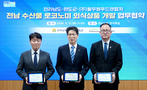전남도는 17일 도청 정약용실에서 완도군, ㈜풀무원푸드앤컬처와 ‘휴게소 특화메뉴 개발 업무협약(MOU)’을 체결했다. 협약식에는 황기연 전남도지사 권한대행과 이범우 완도부군수, 김경순 풀무원푸드앤컬처 부사장이 참석했다.