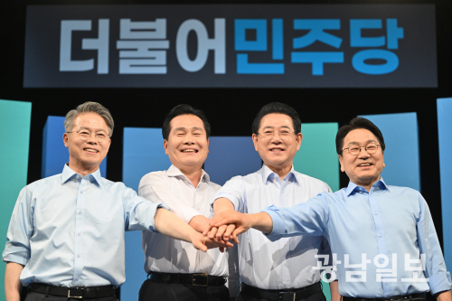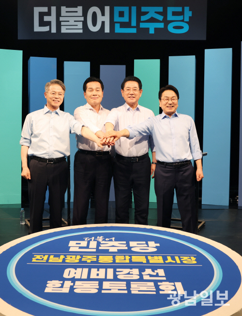 | 민주당 전남광주특별시장 예비경선 합동토론회 17일 오후 광주 남구 월산동 광주MBC 공개홀에서 열린 민주당 전남광주특별시장 A조 경선 토론회에 참여한 후보들이 손을 맞잡으며 승리를 다짐하고 있다. 왼쪽부터 민형배 의원, 주철현 의원, 김영록 예비후보, 강기정 광주시장.최기남 기자 bluesky@gwangnam.co.kr |