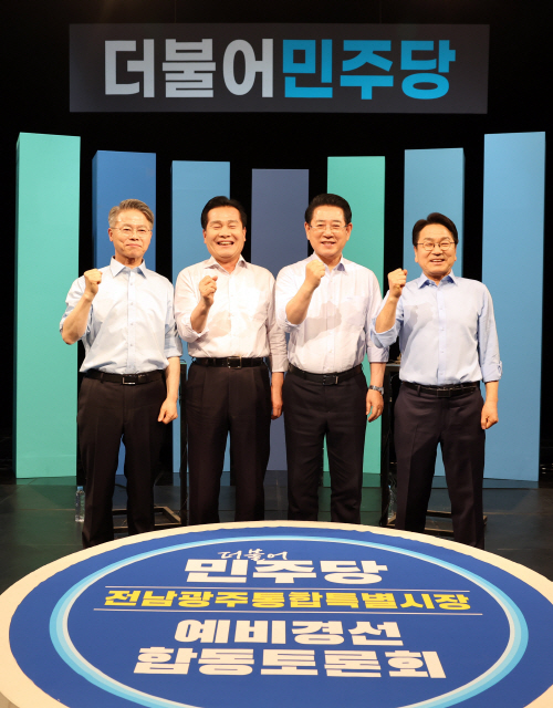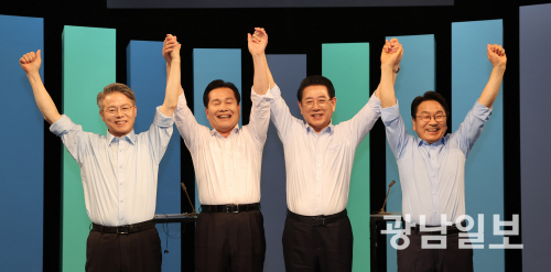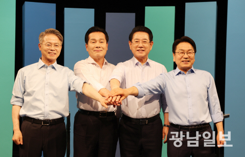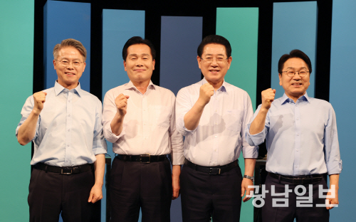 | 민주당 전남광주특별시장 예비경선 합동토론회 17일 오후 광주 남구 월산동 광주MBC 공개홀에서 열린 민주당 전남광주특별시장 A조 경선 토론회에 참여한 후보들이 기념촬영을 하고 있다. 왼쪽부터 민형배 의원, 주철현 의원, 김영록 예비후보, 강기정 광주시장.최기남 기자 bluesky@gwangnam.co.kr |