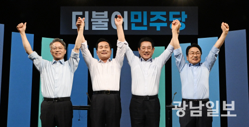 | 17일 오후 광주 남구 월산동 광주MBC 공개홀에서 열린 민주당 전남광주특별시장 A조 경선 토론회에 참여한 후보들이 손을 맞잡으며 승리를 다짐하고 있다. 왼쪽부터 민형배 의원, 주철현 의원, 김영록 예비후보, 강기정 광주시장. 최기남 기자 bluesky@gwangnam.co.kr |