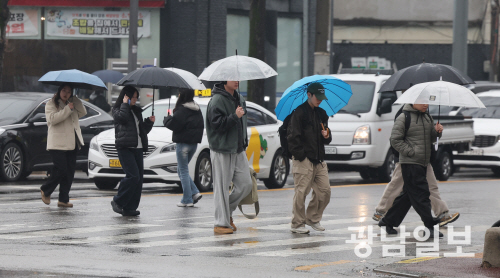 | 광주·전남 지역에 봄을 재촉하는 비가 내린 18일 오후 광주 북구 용봉동 한 횡단보도애서 우산을 쓴 시민들이 걸어가고 있다. 최기남 기자 bluesky@gwangnam.co.kr |