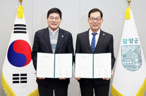 | 정철원 담양군수(왼쪽)과 이정구 국립광주과학관장이 농산어촌 AI·디지털 문해력 제고를 위한 업무협약을 체결하고 기념사진을 찍고 있다. 사진 제공=담양군 |