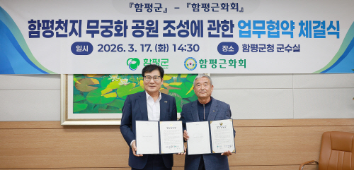 이상익 군수와 정천수 회장 등은 최근 열린 협약식을 통해 나라꽃 무궁화의 가치와 의미를 되새기고 함평천지 무궁화 공원 조성을 위한 상호 협력을 약속하는 뜻깊은 시간을 가졌다.