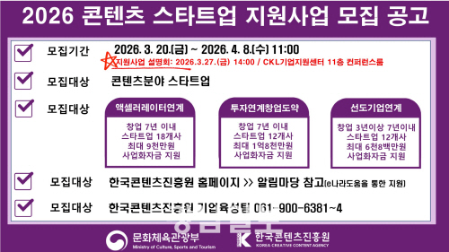한편 ‘2026년 콘텐츠 스타트업 지원사업 설명회’는 오는 27일 광화문 CKL기업지원센터 11층 컨퍼런스룸에서 열린다.