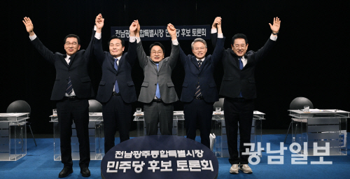| 25일 오후 광주 서구 광천동 KBC광주방송에서 열린 민주당 전남광주특별시장 본경선 토론회에서 후보들이 토론에 앞서 손을 맞잡고 있다. 왼쪽부터 신정훈, 주철현, 강기정, 민형배, 김영록 후보. 최기남 기자 bluesky@gwangnam.co.kr |