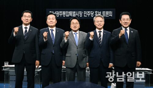 | 25일 오후 광주 서구 광천동 KBC광주방송에서 열린 민주당 전남광주특별시장 본경선 토론회에서 후보들이 승리를 다짐하고 있다.왼쪽부터 신정훈, 주철현, 강기정, 민형배, 김영록 후보.최기남 기자 bluesky@gwangnam.co.kr |