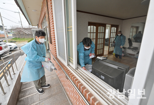 | 25일 오전 광주 서구 서창발산경로당에서 서구보건소 감염병관리과 방역대응팀원들이 방역 소독을 하고 있다.광주 서구는 감염병에 취약한 고령자 이용 시설과 위생적으로 취약한 환경에 노출된 방역 취약 세대에 휴대용 방역 소독기와 바퀴벌레 및 모기 퇴치 약품을 활용해 방역 소독을 하고 있다. 최기남 기자 bluesky@gwangnam.co.kr |