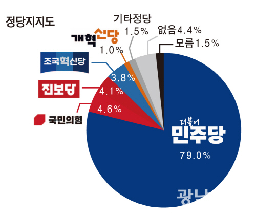 25일 광남일보가 여론조사 전문기관 ‘코리아정보리서치’에 의뢰해 지난 20~21일 광주 북구에 거주하는 만 18세 이상 남녀 504명을 대상으로 실시한 여론조사를 실시한 결과, ‘정당지지도’를 묻는 질문에 대해 응답자 79.0%가 더불어민주당을 선택한 것으로 나타났다.