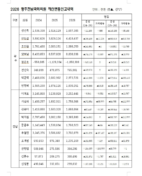반면 신정훈 의원(나주·화순)과 조인철 의원(광주 서구갑)은 재산 신고액이 줄었다.