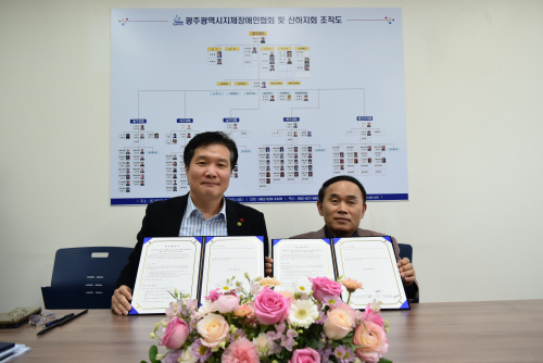 | 사단법인 광주지체장애인협회와 ㈜공동체는 26일 광주지체장애인협회 본부에서 지체장애인의 경제적 자립과 사회참여 확대를 위한 업무협약을 체결했다. 사진제공=사단법인 광주지체장애인협회 |