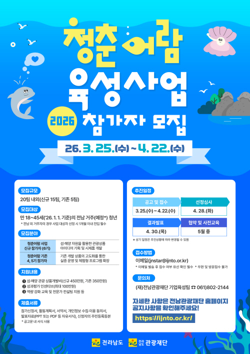 한편 참여를 희망하는 청년은 4월 22일까지 이메일(jnstar@ijnto.or.kr)을 통해 접수 가능하며, 자세한 사항은 전남관광재단 누리집 내 공고문을 통해 확인할 수 있다.