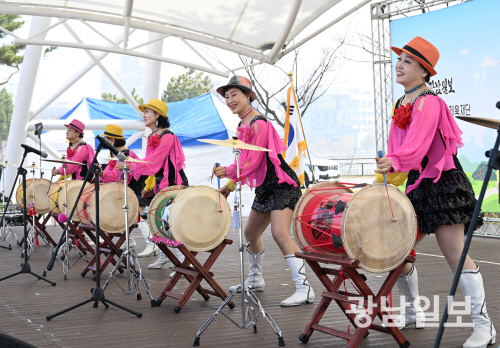 | 28일 오전 전남 나주시 빛가람 호수공원 일원에서 열린 ‘제22회 영산강 사랑 시·도민 한마음 걷기대회’식전 공연에서 한국 고고장구 광주북구지부 회원들의 신명난 난타 공연이 펼쳐지고 있다. 최기남 기자 bluesky@gwangnam.co.kr |